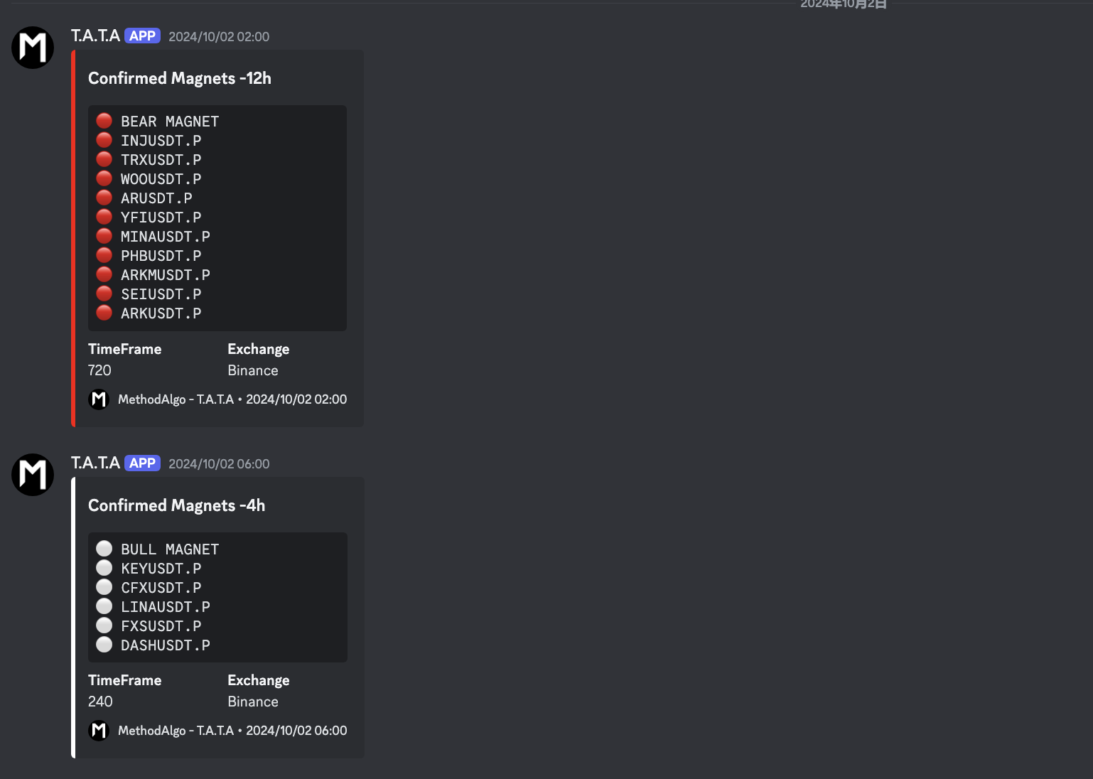 - HTF (High Time Frame) Channel: Alerts are sent for magnet formations on 4h, 12h, 1d, and 3d timeframes.