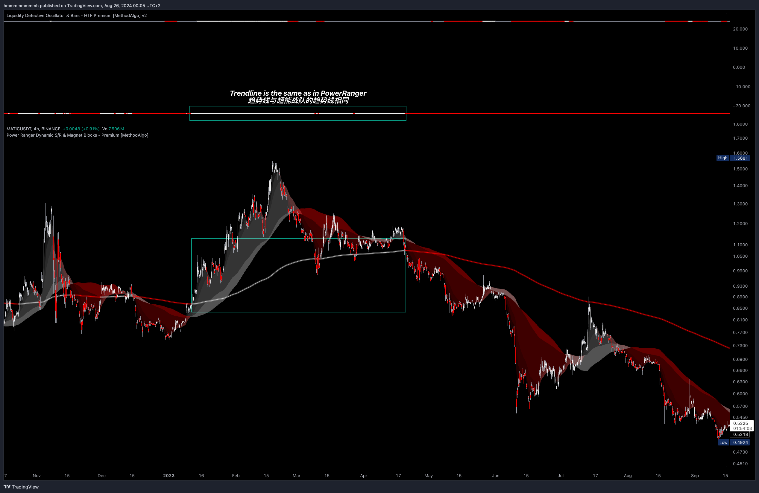 The example below shows that the trendline in Liquidity Detective is identical to the trendline in the Power Ranger indicator.
