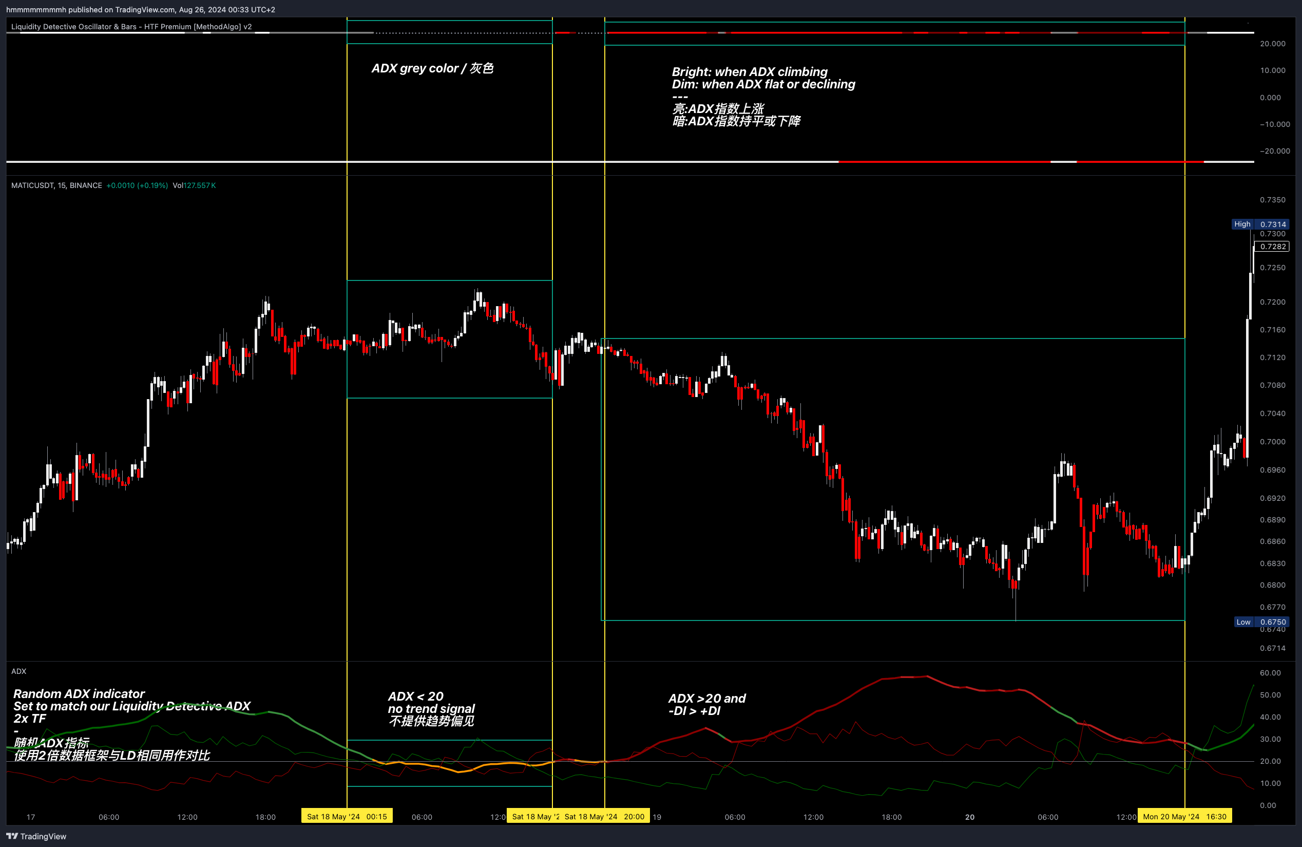 - Entering during gray dotted ADX lines is allowed but not ideal. Prices will only start to rise or fall when the ADX line turns bright. Without trend strength, price movements are minimal. If you have other tools signaling a bias, the gray dotted ADX line isn't a negative factor. If no other analysis provides a bias, avoid entering during this time.