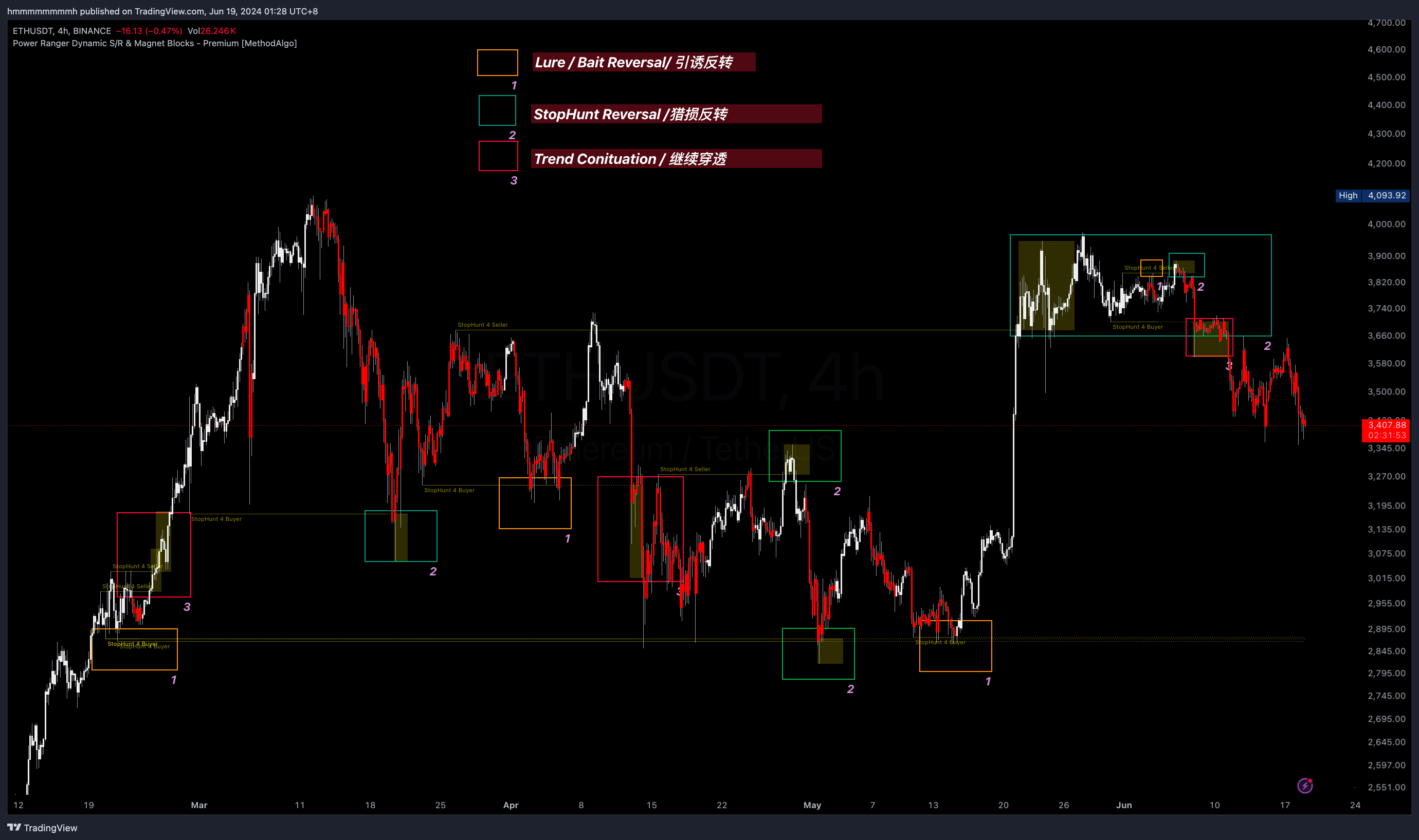 There are 9 successful reversal opportunities and 3 continuation cases. to note that the continuation with the red boxes represent normal expectations, not strategy failures, as described in Phase and Reversal Strategy. When the price enters the StopHunt zone, traders should observe the candle's exit direction to judge a reversal and increase bias.