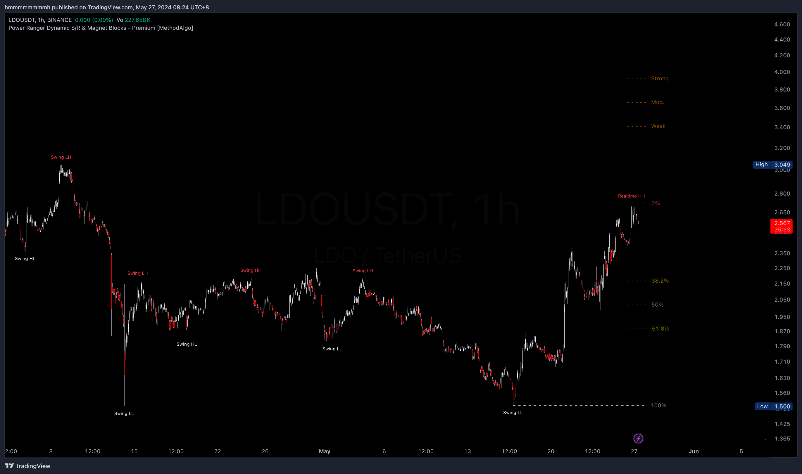 Swing + (HH/HL/LH/LL)likeSwing HL, swing highs are red, swing lows are white. - Real-time Swing Labels: When the price breaks the current swing high or low, PowerRanger adopts the new position as the new swing level, marked as