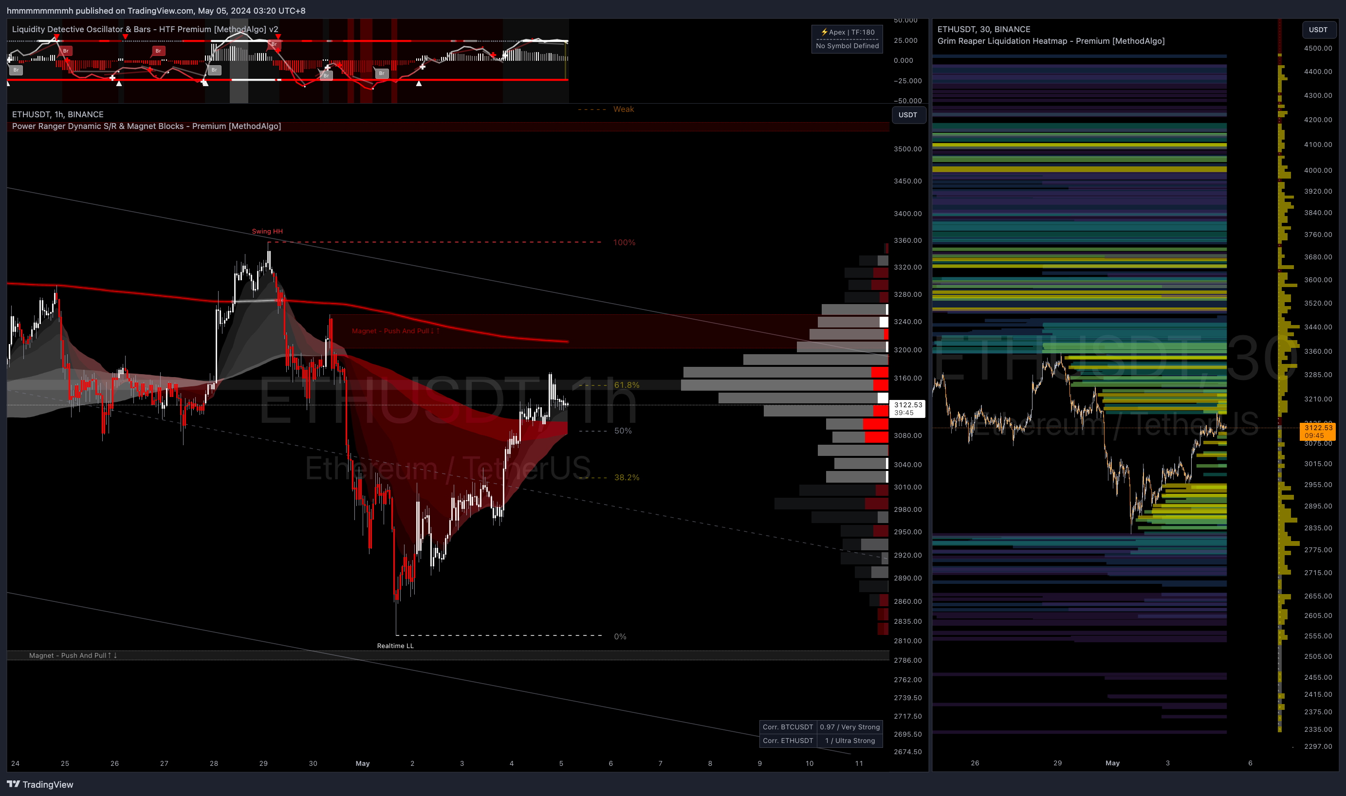 建议将死神清算图的时间定格为一个时间框架的图表,而不是不停切换各种时间框架,否则你难以在短时间内摸到规律, 使用死神的最佳图表设置是购买TradingView的会员获得分屏功能,将死神作为副图表定格30m时间框架并与主图表的Symbol同步,配合观察分析,保持主图表的整洁
