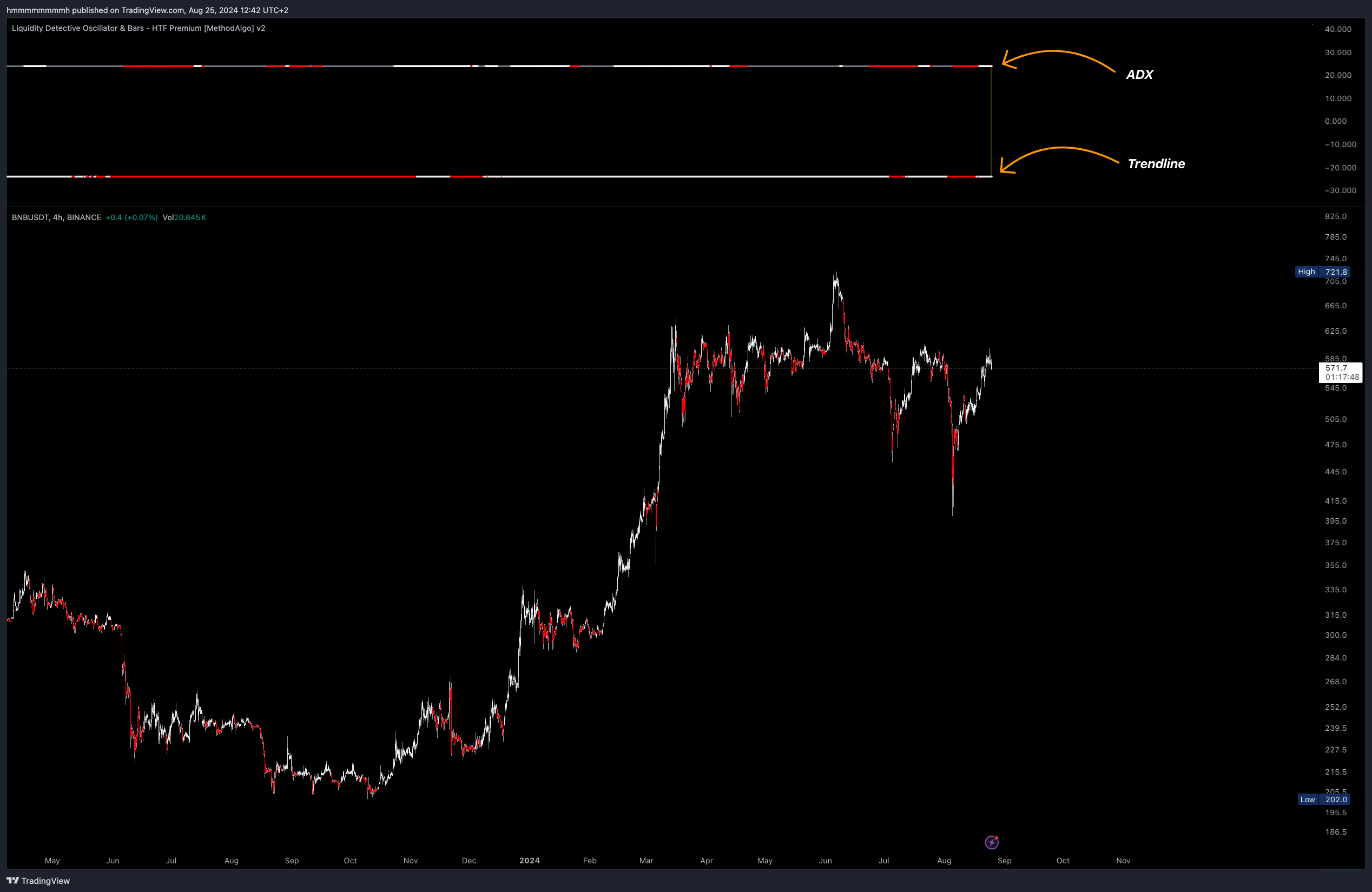 在流动性侦探中,我们通过上下两根固定水平线的颜色变化,简化了复杂的ADX和趋势线的信号。这些线以红白两色显示,为您提供更直观的趋势分析。同时,流动性侦探默认使用图表2倍时间段的数据来计算ADX趋势,提供更持久的分析。