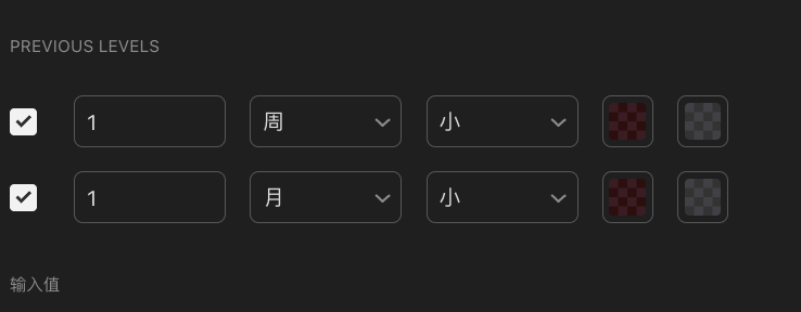 在超能战队的Features栏目中打开Previous Levels后, 可在下方找到详细设置, 目前,本工具支持设置2套时间支撑与阻力,并可灵活开启关闭,每套时间支撑阻力设置选项依次为:
