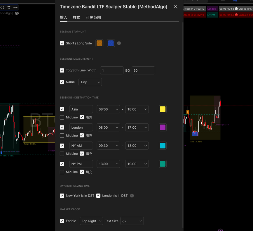 加密货币市场与外汇市场一样,具有24小时不间断交易和显著的时区特性。MethodAlgo的时区劫匪(Timezone Bandit)指标正是基于时间这一核心参数开发的。全球四大重要交易时区(亚洲、伦敦、纽约、盘后)的价格行为往往呈现出明显的规律性和可分析性。